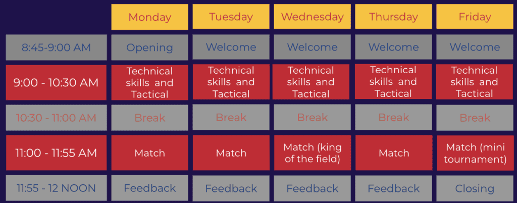 5 days of training under the Barça Methodology with a Technical Director from FC Barcelona. We will provide snacks to the players every day.